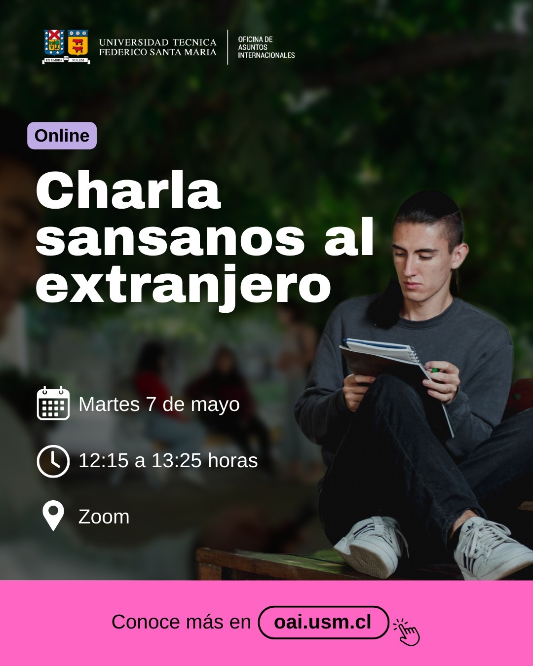 Asiste a la Charla Sansanos al Extranjero que se realizará online el día martes 07 de mayo a las 12:15 horas vía Zoom y resuelve tus dudas.