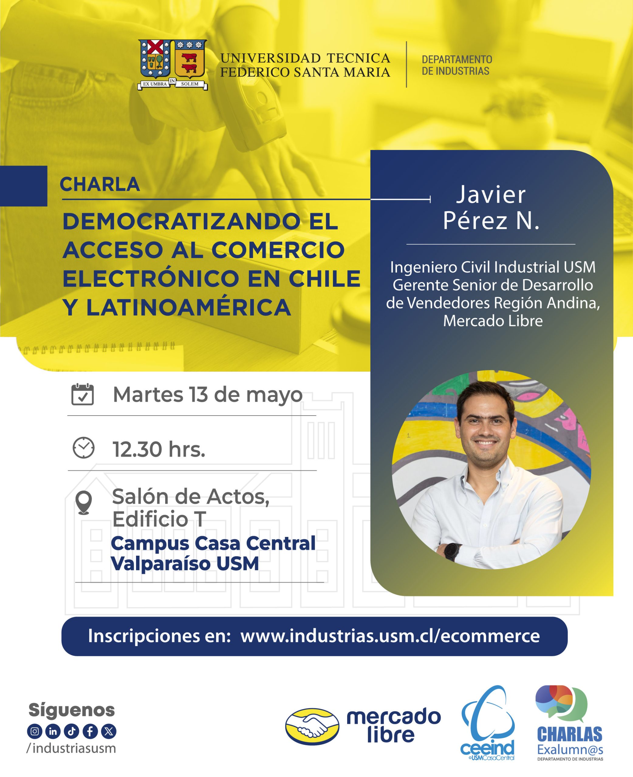 En esta ocasión, el exalumno Javier Pérez Núñez, Ingeniero Civil Industrial USM, quien se desempeña como Gerente Senior de Desarrollo de Vendedores Región Andina en Mercado Libre, abordará el uso de la tecnología e innovación como herramienta para democratizar el acceso al comercio y servicios financieros en Latinoamérica, y como eso impacta en la vida de miles de emprendedores en la región.