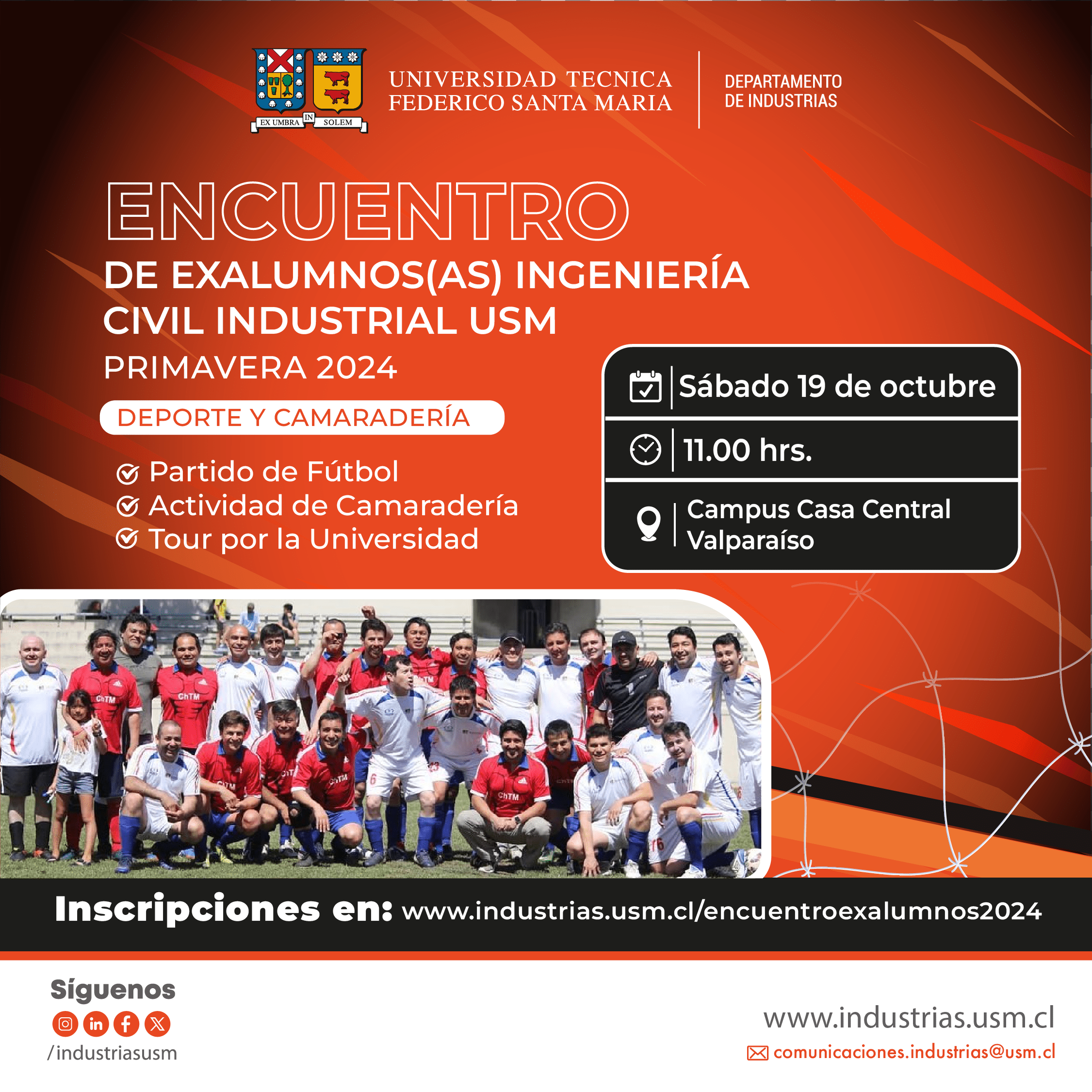 Te invitamos a participar del Encuentro de Exalumnos(as) de Ingeniería Civil Industrial USM – Primavera 2024, actividad que tiene como objetivo reunirnos en torno a la camaradería, el deporte y los recuerdos de la vida universitaria.