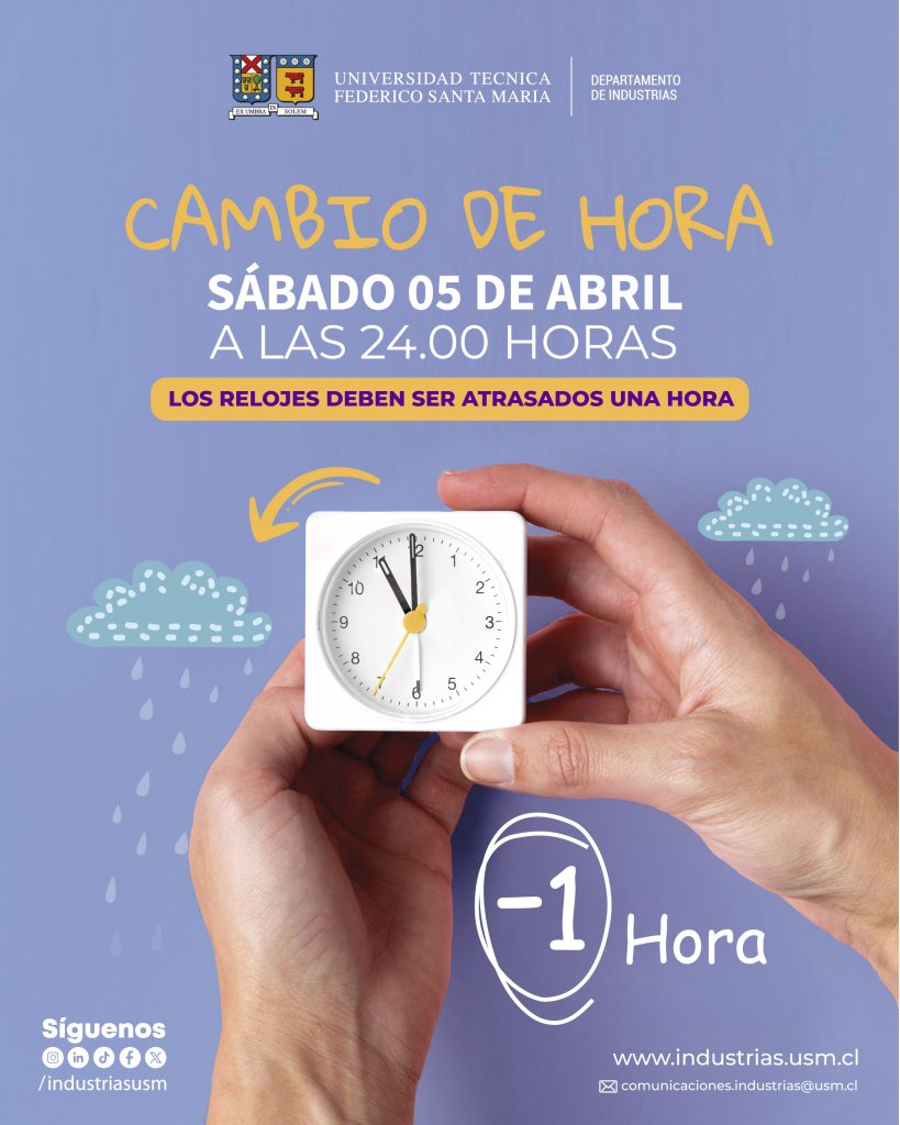 Cuando sea la medianoche (24.00 horas), deberás retroceder tus relojes en 1 hora en Chile Continental (a excepción de la Región de Magallanes y la Antártica Chilena).