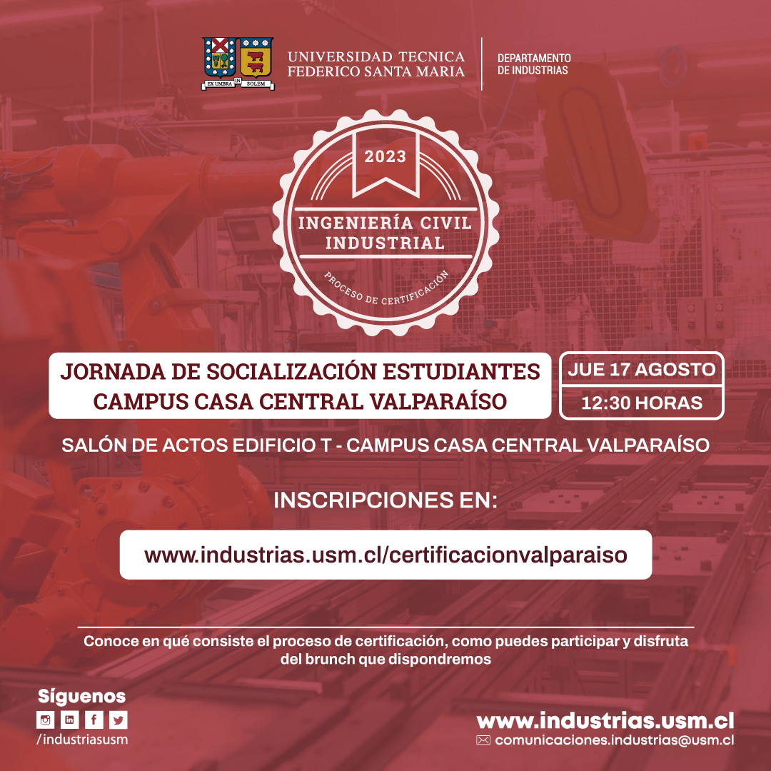 Te invitamos a participar de la Jornada de Socialización del Proceso de Certificación de Ingeniería Civil Industrial que se realizará en Campus Casa Central Valparaíso.