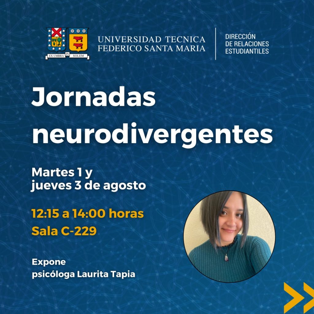 La Dirección de Relaciones Estudiantiles y la iniciativa estudiantil Neourodivergencias USM te invitan a participar de las “Jornadas Neurodivergencias” a realizarse presencialmente en Campus Casa Central Valparaíso.