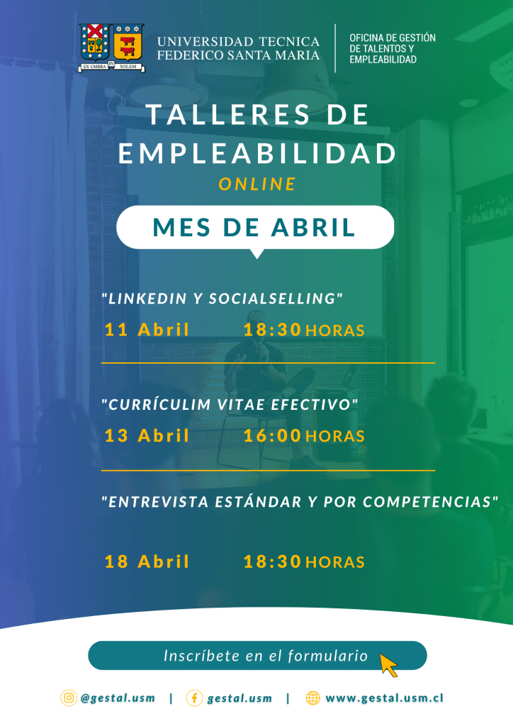 La Oficina de Gestión de Talentos y Empleabilidad de la Universidad Técnica Federico Santa María invita a las y los ex alumnos a participar de los Talleres de Empleabilidad programados para el mes de abril 2023: