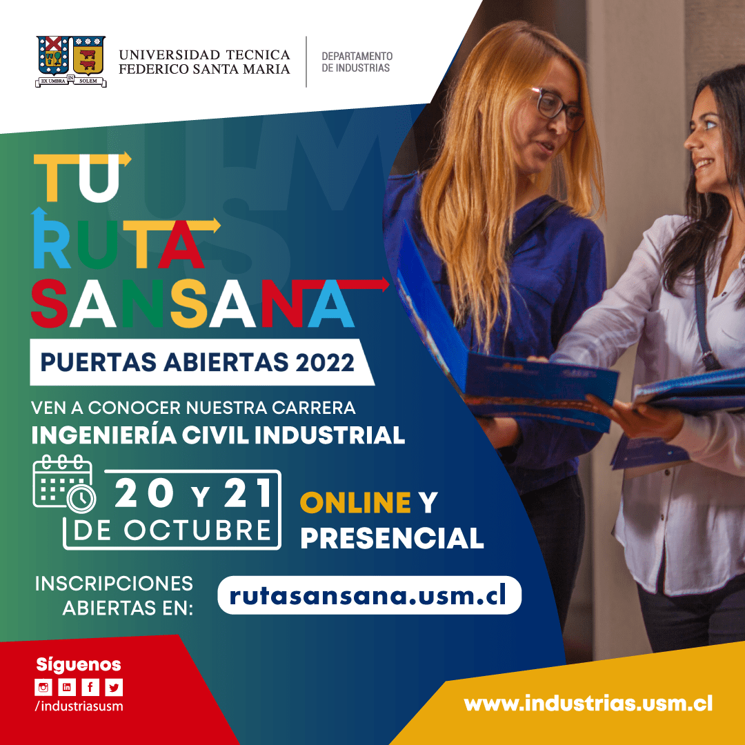 Te invitamos a participar de «Tu Ruta Sansana», Puertas Abiertas 2022, visitar los Campus Casa Central Valparaíso y Campus Santiago Vitacura USM y participar de las actividades y talleres de Ingeniería Civil Industrial, donde podrás conocer en qué consiste nuestra carrera y resolver las dudas o consultas.