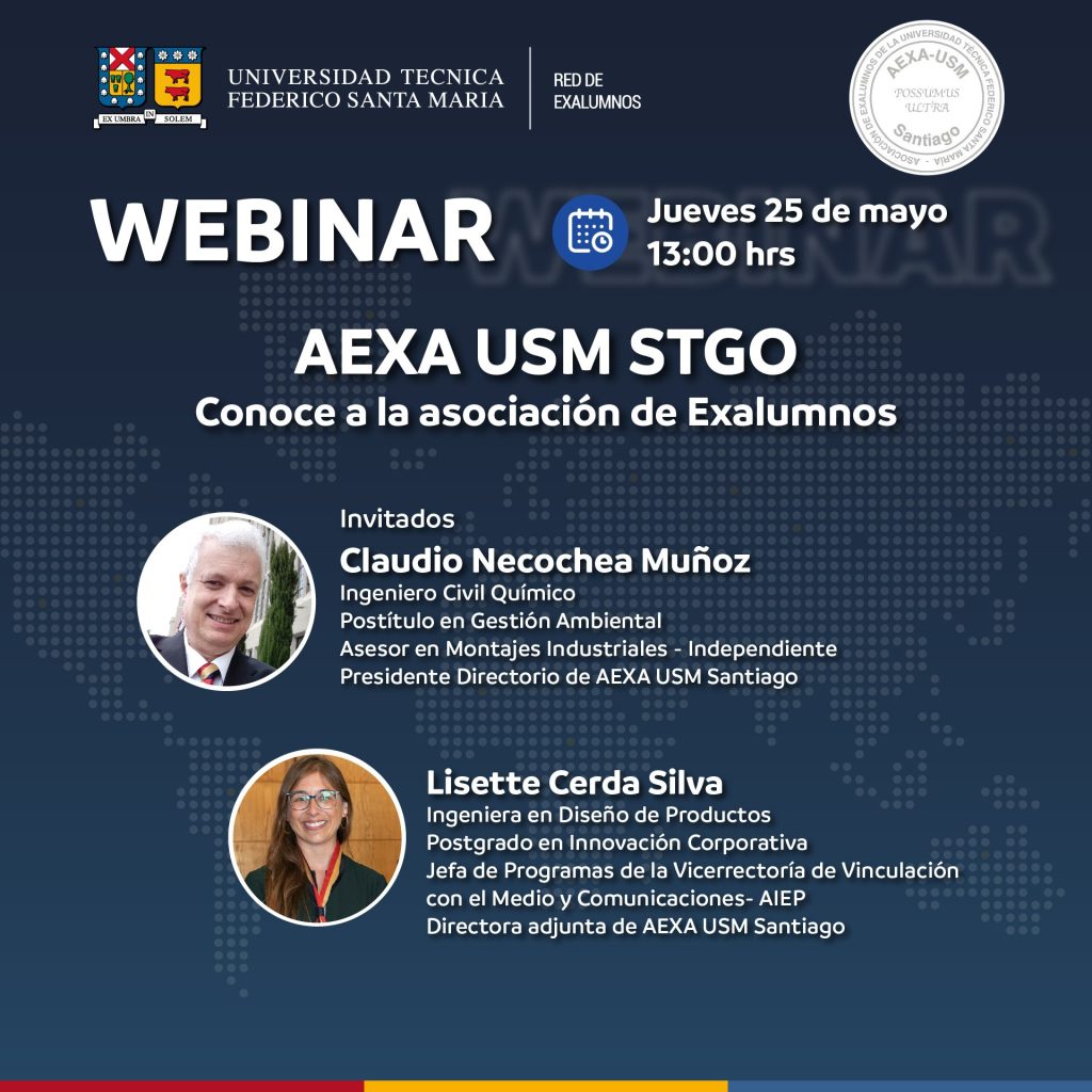 ¿Quieres ser parte de la Asociación de Exalumnos(as) USM en Chile? ¿Conoces a sus integrantes? ¿Cuál es el objetivo de ella? Te invitamos a participar del webinar donde Claudio Necochea Muñoz, Presidente del Directorio de AEXA USM Santiago y Lisette Cerda Silva, Directora adjunta de AEXA USM Santiago, resolverán estas y más dudas o consultas.