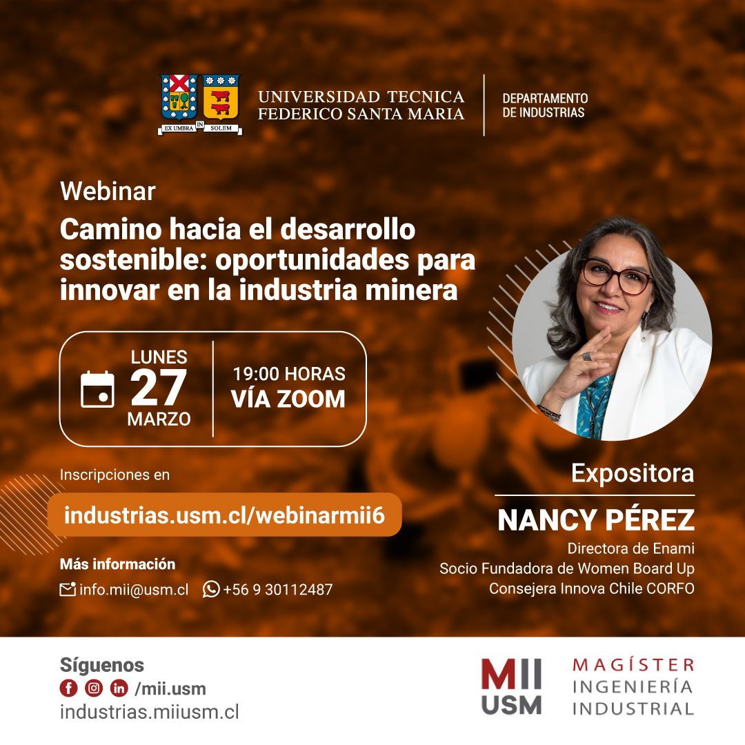 Te invitamos a participar del Webinar “Camino hacia el Desarrollo Sostenible: Oportunidades para Innovar en la Industria Minera», a cargo de Nancy Pérez, Directora de Enami, Socia Fundadora de Women Board Up y Consejera de Innova Chile Corfo, en el cual se analizará el escenario actual de la minería en Chile y el mundo, estableciendo las oportunidades existentes y cómo, mediante la innovación, generar valor en la industria con vías hacia un futuro sostenible.