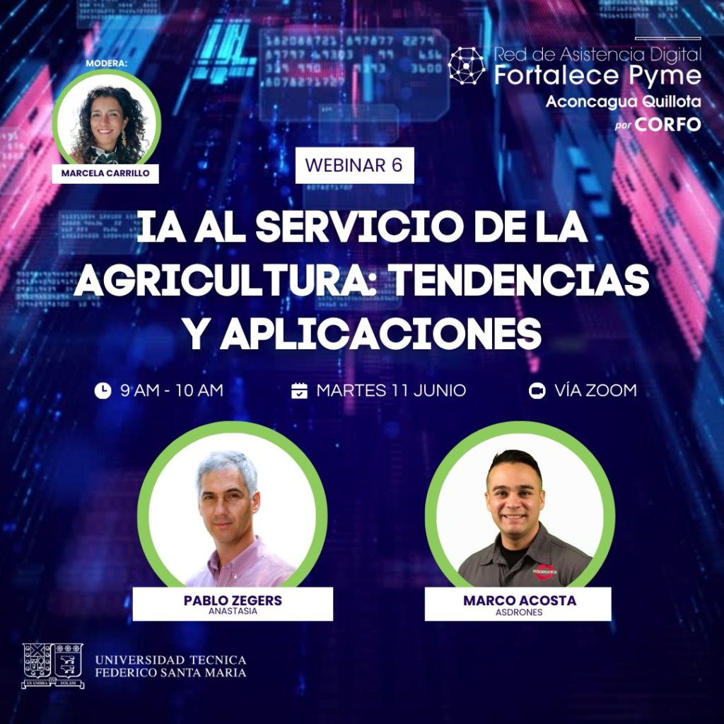 Te invitamos a participar del Webinar “IA al Servicio de la Agricultura: Tendencias y Aplicaciones”, instancia donde nos adentraremos en el mundo de la Inteligencia Artificial junto a Pablo Zegers, Cofundador y CEO de Anastasia, empresa chilena líder en Inteligencia Artificial enfocada en Pymes y ganadora del Premio Nacional de Innovación Avonni 2021, así como también, conoceremos las ventajas del uso de drones y su revolucionario monitoreo aéreo en el campos, con Marco Acosta de Asdrones.