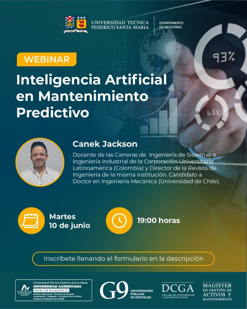 El Diploma en Confiabilidad y Gestión de Activos – DCGA – de la Universidad Técnica Federico Santa María, te invita a participar del Webinar “Inteligencia Artificial en Mantenimiento Predictivo”, en el cual Canek Jackson, Docente y Editor de la Revista de Ingeniería de la Corporación Universitaria Latinoamericana de Colombia, explorará el uso de la IA en Mantenimiento Predictivo, desde el manejo masivo de datos hasta casos reales aplicados por el propio expositor. Descubre cómo estos algoritmos están transformando la industria.