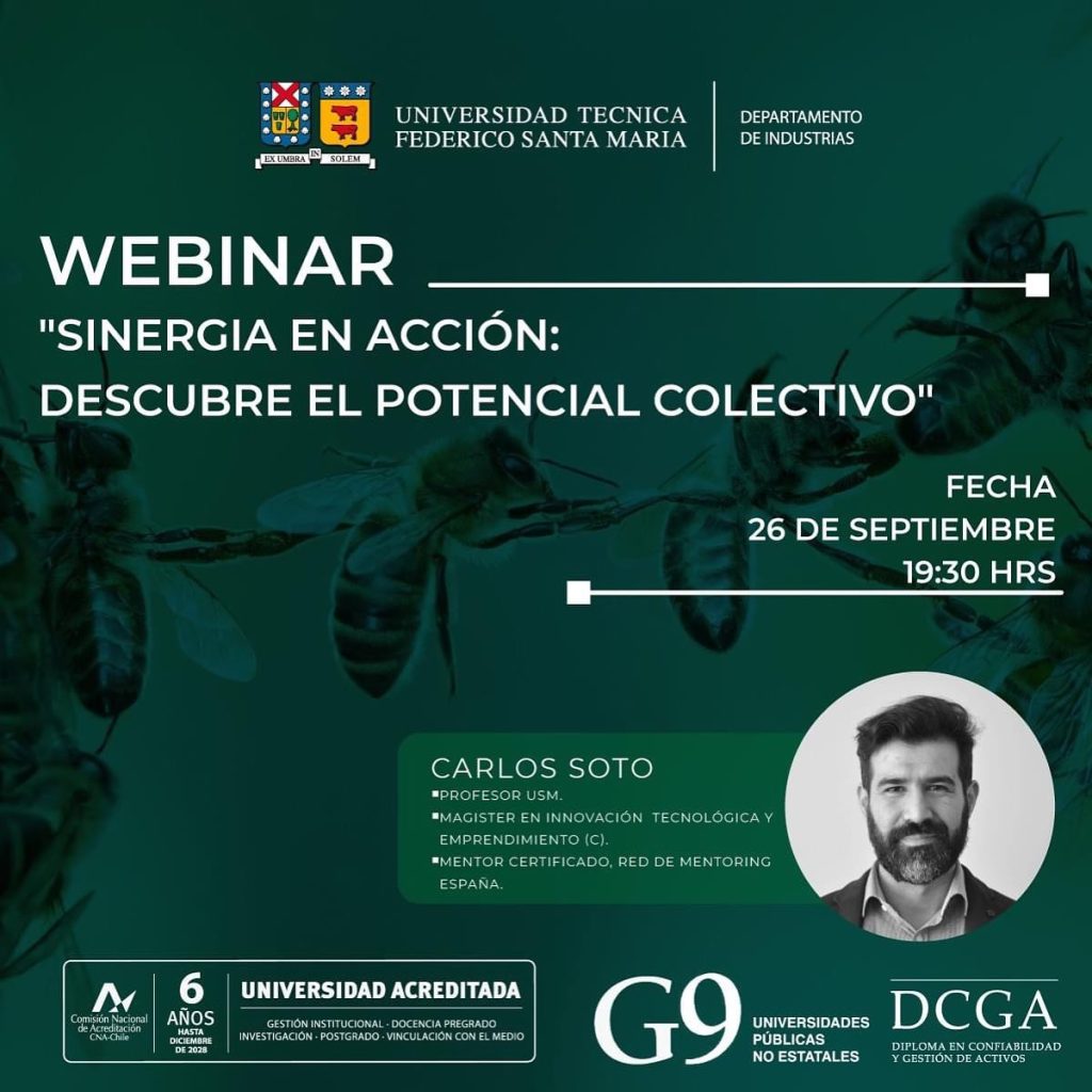 Te invitamos a participar del Webinar «Sinergía en Acción: Descubre el potencial colectivo», presentado por el profesor Carlos Soto Yáñez y organizado por el Diploma en Confiabilidad y Gestión de Activos de la Universidad Técnica Federico Santa María.