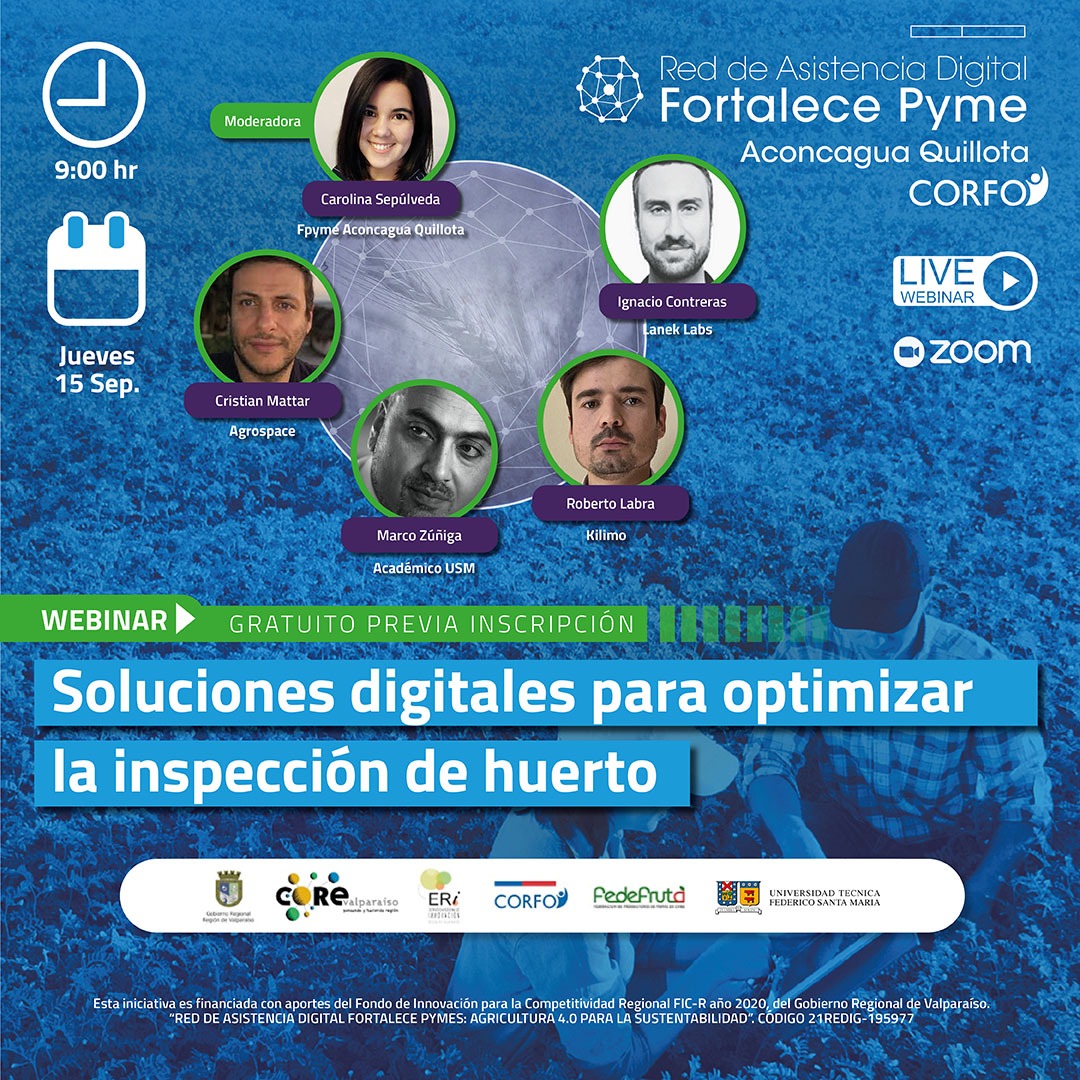 Te invitamos a participar del Webinar “Soluciones Digitales para Optimizar la Inspección de Huerto”, actividad enmarcada en el ciclo de seminario “transformación Digital: Agricultura competitiva en un entorno desafiante” organizada por la Red de Asistencia Digital Fortalece Pyme Aconcagua – Quillota y donde el Departamento de Industrias de la Universidad Técnica Federico Santa María es un socio estratégico.